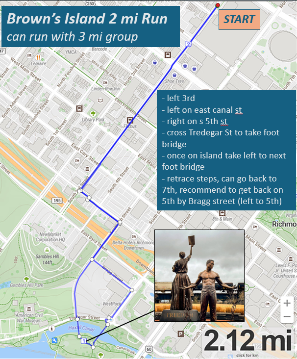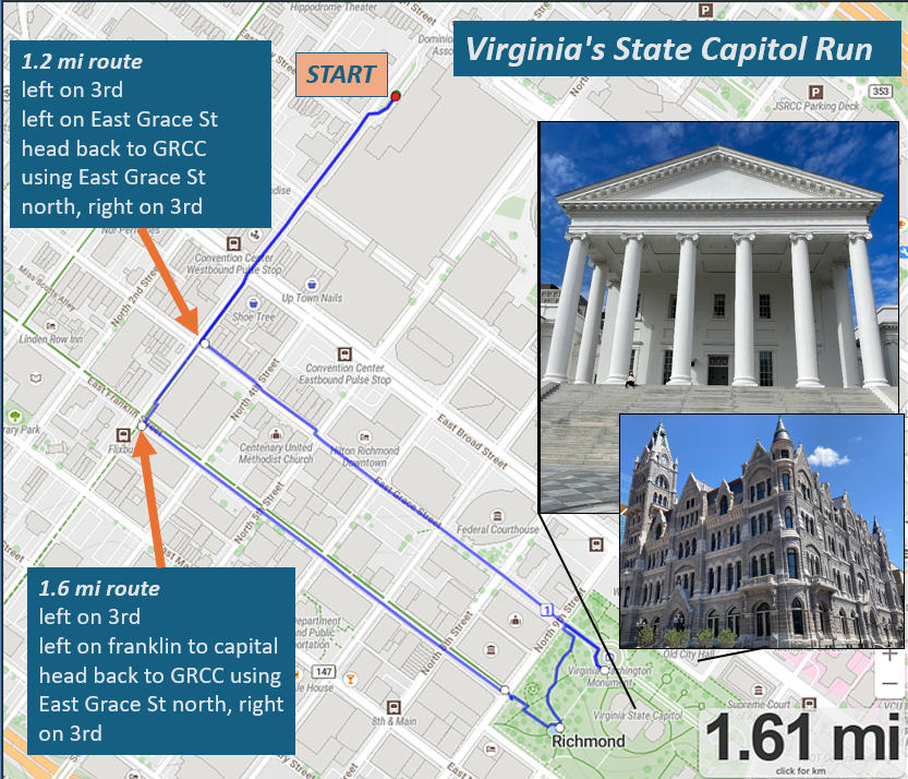 CERF Wellness & CERFers on the RunCERFers on the Run is an informal running club that gets together to run and exercise throughout the cities that the CERF Biennial Conference visits. This year, the CERFers on the Run will be meeting at 6:00 AM and 6:50 AM to run at 6:15 am and 7:00 am, respectively, before the oral sessions start, Monday through Thursday. Each day, there will be two different group runs, consisting of a long (about 3 miles) and short (about 1 mile) run. CERFers on the Run will meet at the Wellness table within the Greater Richmond Convention Center (GRCC) near the registration desk. Sign-in each morning, as the top participant for each running time will win a prize! Meet, Greet, and stretch with your fellow runners and group yourselves for your run of interest and go for a run! All of the runs below include park site and historic landmarks in Richmond, as well as the infamous view of the James River. Running routes are below and small print outs will be available at the CERF Wellness table each morning. Not a runner, but need some AM exercise? We got you!