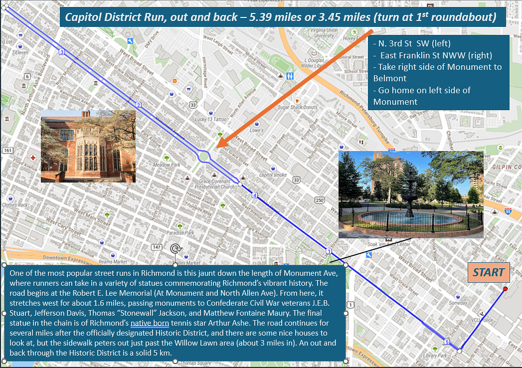 CERFers on the Run Maps & Routes1.2 Mile & 1.6 Mile Virginia's State Capitol Run Brown's Island 2 Mile, Lollipop Run Brown's Island and T.Tyler Potter Memorial Bridge 3 Mile Run Capitol District Run of 5.39 Miles, Out and Back Run Other Routes Forest Hill Park Trail - 3.3 Miles Buttermilk Trail - From the Nickel Bridge, it loops under the bridge and continues down along Riverside Dr. The trail runs about 3 miles. Forest Hill Park Trail Loop - The trail loop is about 3 miles. Belle Isle - By parking at the Belle Isle Parking Lot, you can cross the Belle Isle Pedestrian Bridge and hop on a wide hard packed trail that loops around the isle. The loop itself is a little less than a mile. |